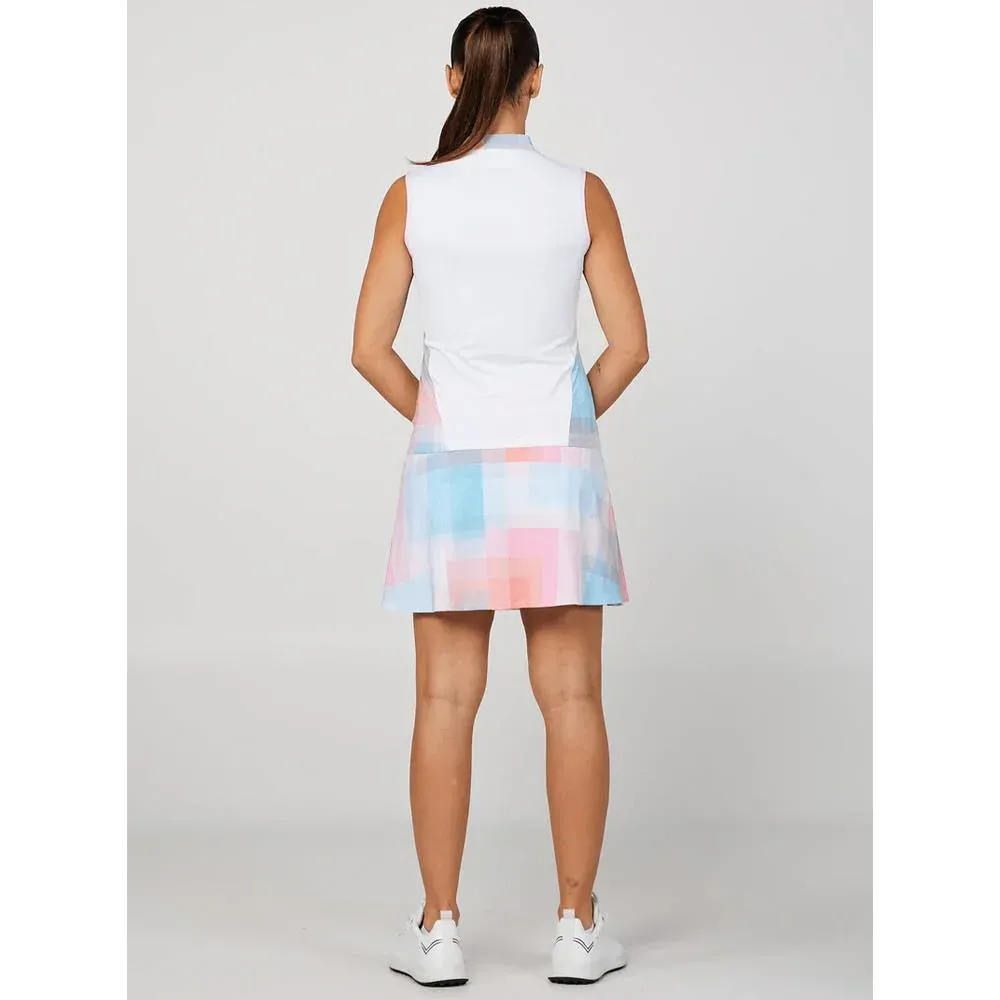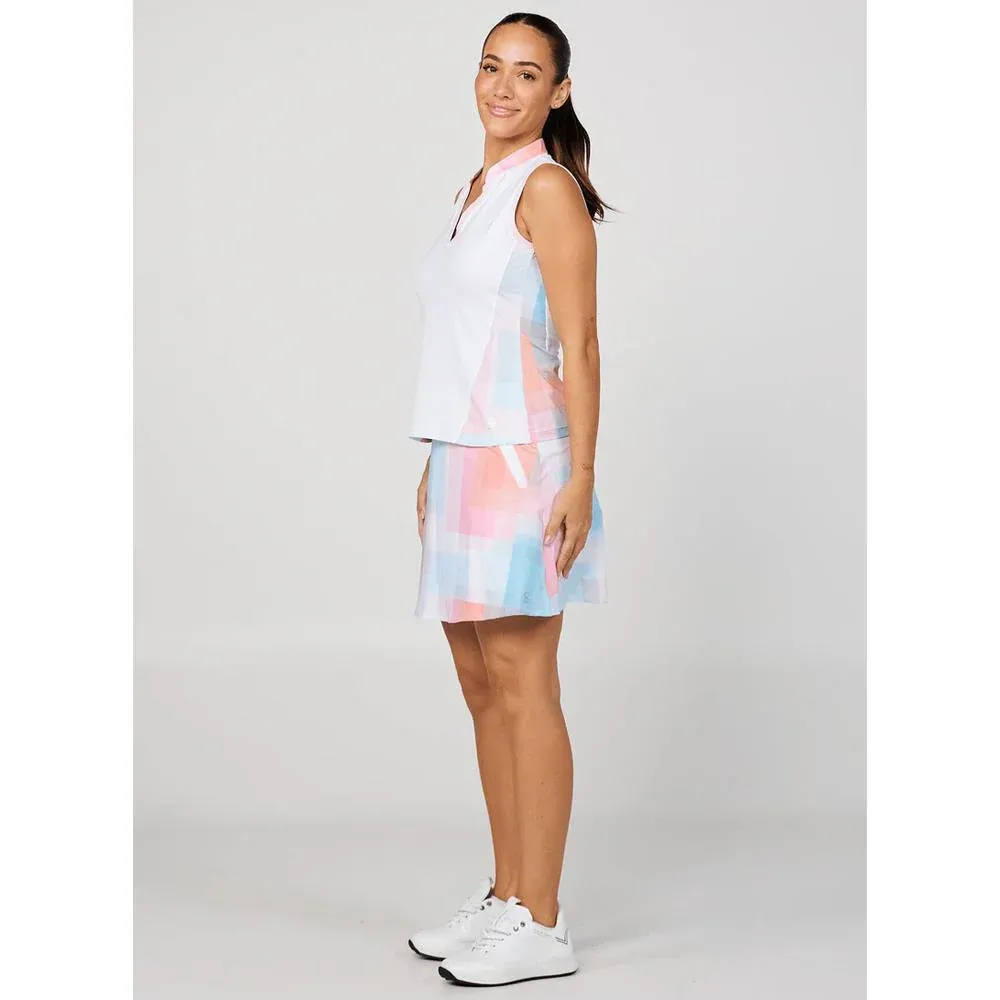 Cute and stylish tank for outdoor athletics. This white golf sleeveless top provides coverage while a flattering pull-on neckline effortlessly adds a classy vibe. Printed inserts on the sides and trims. Performance fabrics will keep you cool and comfortable: UV protection, wicking, quick drying, pilling resistant, super soft and stretchy.
