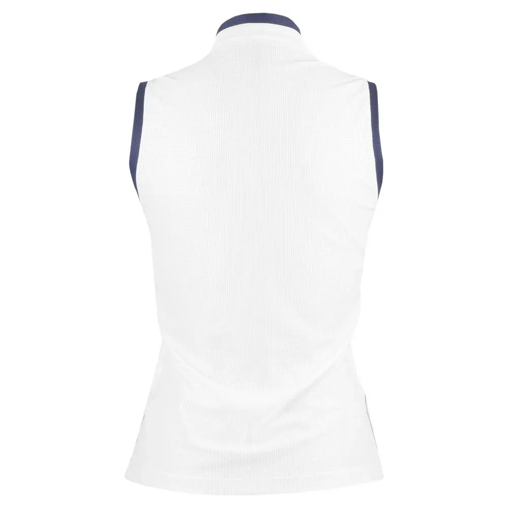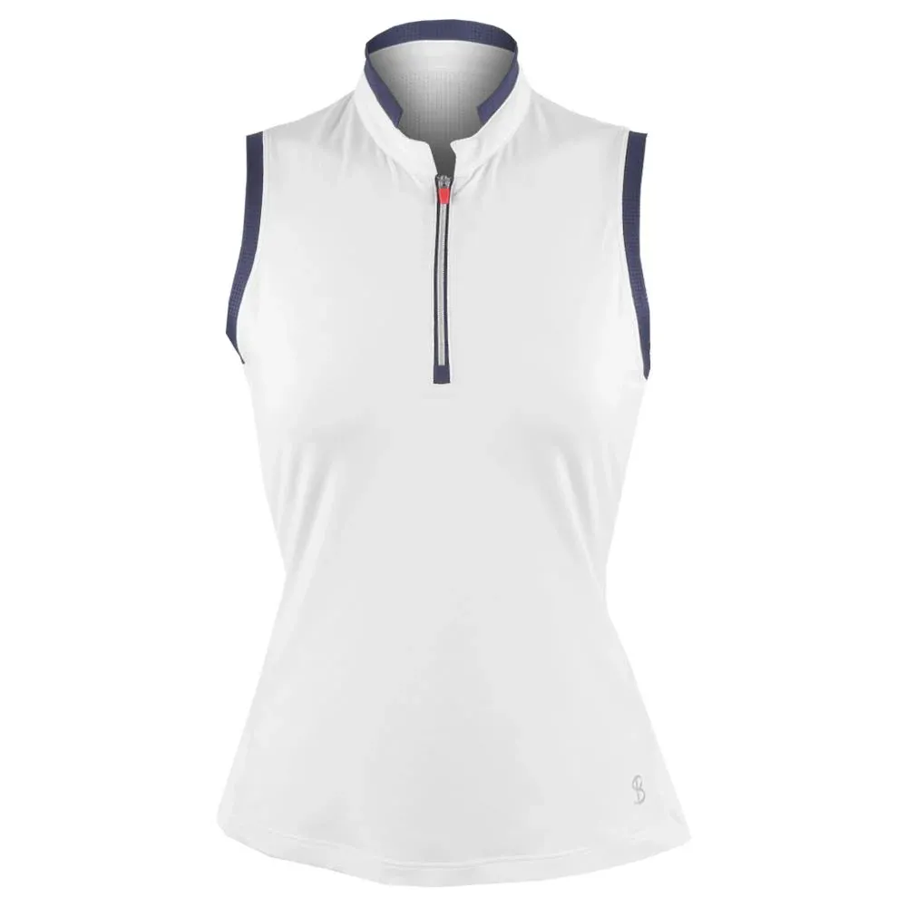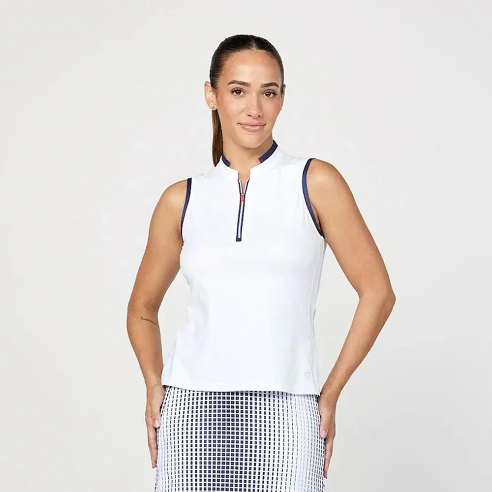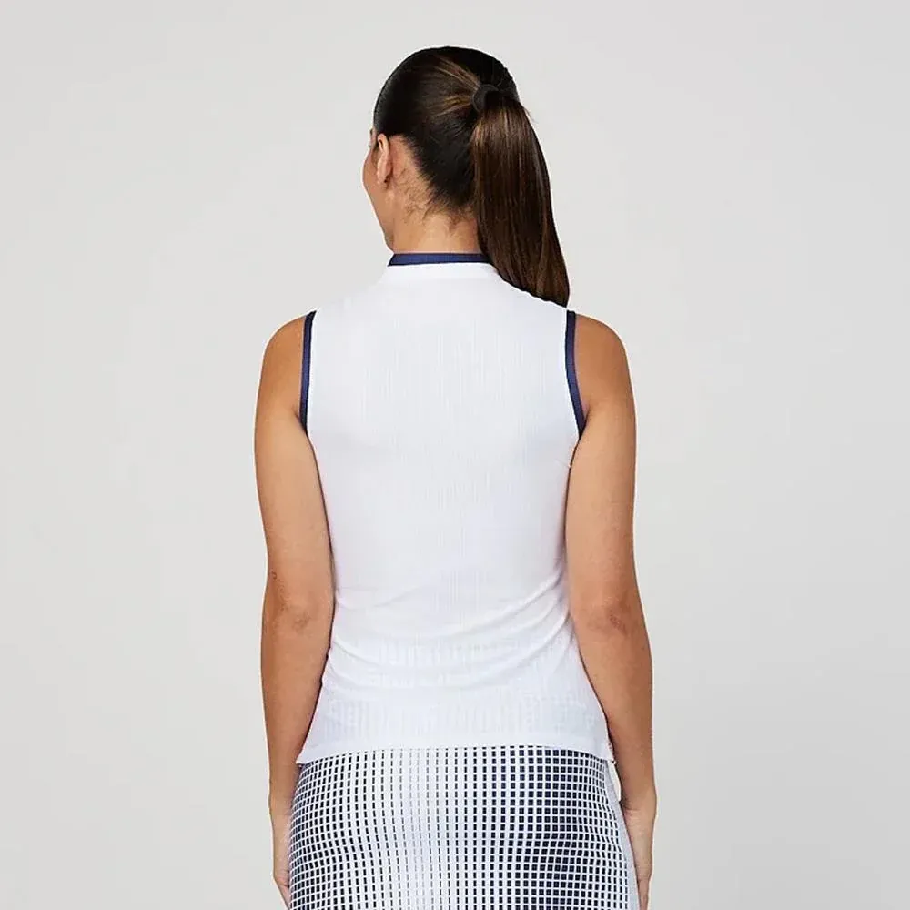 Classic and classy style in a great tank ready for the court. The innovative band collar and unexpected side inserts adorned with the Colourblock Trim from this collection make this piece unique and flattering. The back panel made out of Bella mesh provides plenty of coverage and ventilation. In your choice of navy with white trim or white with navy trim. Delivers comfort and 50 UPF sun protection.